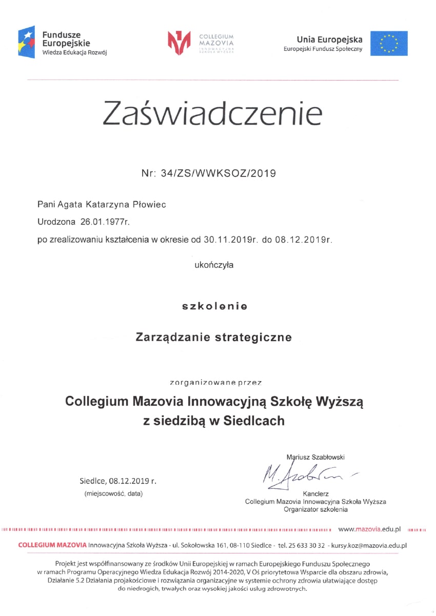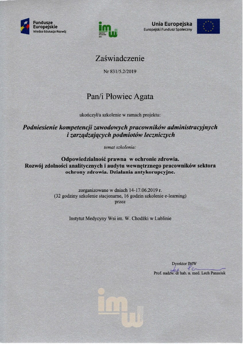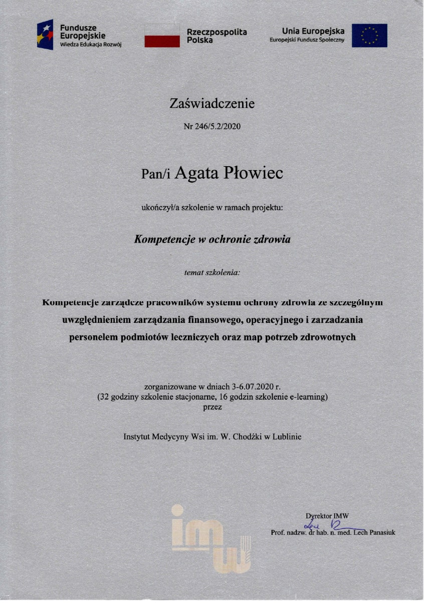 Aby stale rozwijać swoje kompetencje i podnosić jakość pracy z personelem medycznym i administracyjnym, uczestniczyłam w licznych kursach i szkoleniach. Poniżej prezentuję najważniejsze z nich: