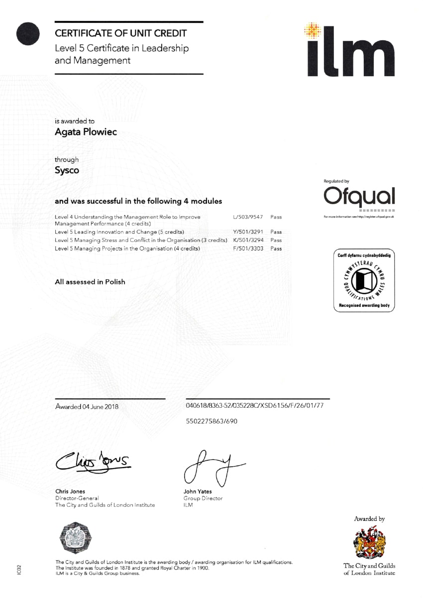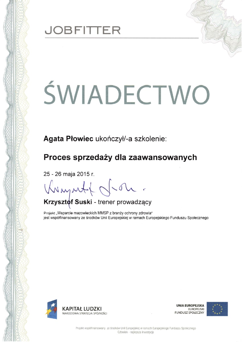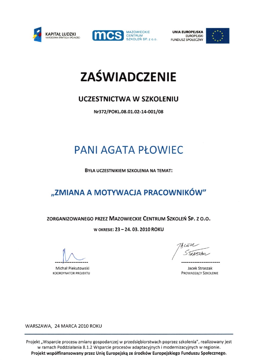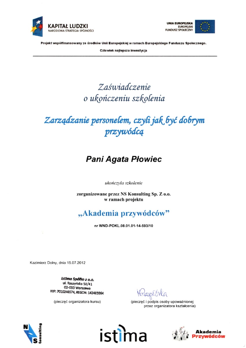 Aby stale rozwijać swoje kompetencje i podnosić jakość pracy z personelem medycznym i administracyjnym, uczestniczyłam w licznych kursach i szkoleniach. Poniżej prezentuję najważniejsze z nich: